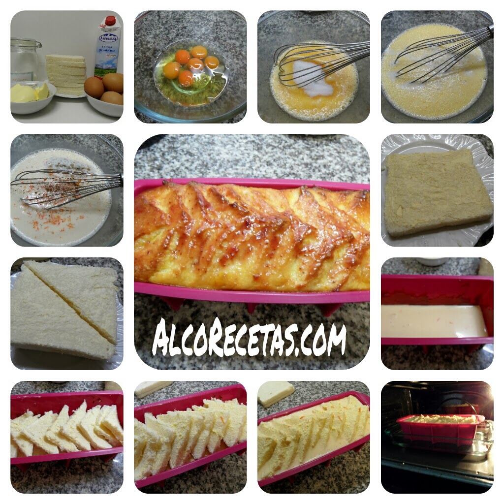 Echamos un poco del batido en el molde, colocamos las rebanadas de pan echamos el resto de batido.